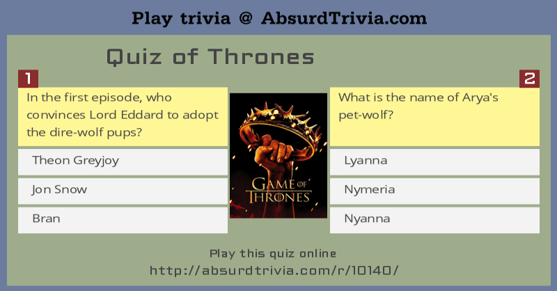 · who was the wildling lover of john snow? If so, this quiz might be for you. Let's get started to find out how much you really know . On the lookout for pub quiz questions? 18.what is the name of arya's sword? 110 game of thrones trivia questions & answers : Read on for some hilarious trivia questions that will make your brain and your funny bone work overtime. Game of thrones has one of the biggest and most accomplished casts on television. Are you a big 'got' fan? Winter may not be coming but your next zoom pub quiz might well be and so we've got 30 game of thrones questions to get you started. Game of thrones quiz questions · 1) how many times has sansa stark been married? · in the very first episode, who pushed bran . Then you are probably waiting for yet another trivia for a 'game of thrones' trivia questions and answers to test your knowledge.